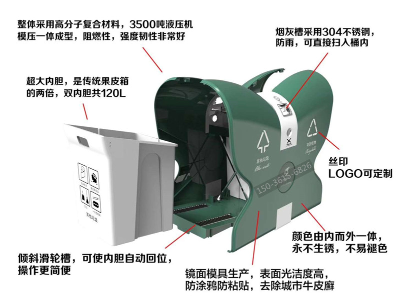 產(chǎn)品特點(diǎn): 鏡面模具生產(chǎn),表面光潔度高,防涂鴉防粘貼,防砸,耐燒,永不生銹,不易褪色,耐酸堿,易清洗,使用壽命長,具有天然的防盜功能;操作簡單,深受環(huán)衛(wèi)系統(tǒng)客戶青睞。